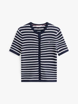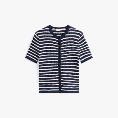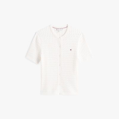 This short-sleeved cardigan with an intricate, fine gauge cable knit is a fresh take on a classic design, offering day-to-evening style.