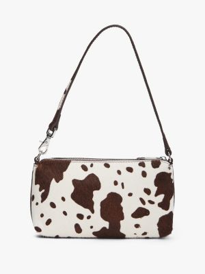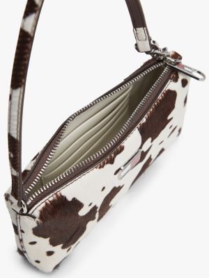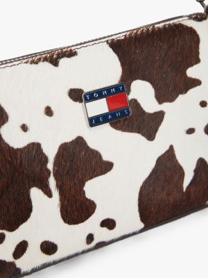 This calf hair wallet features a striking cow print, while the movable strap lets you wear it on the shoulder or wrist.