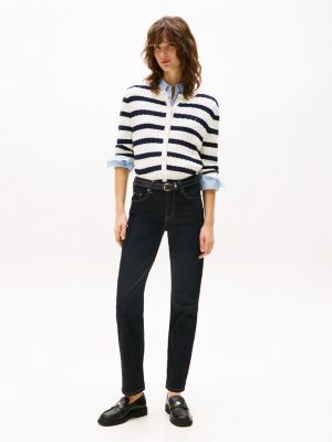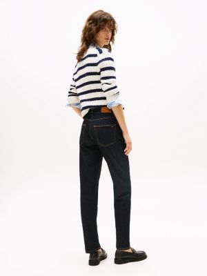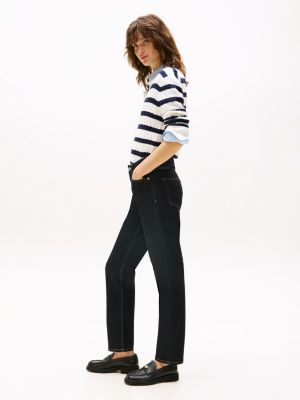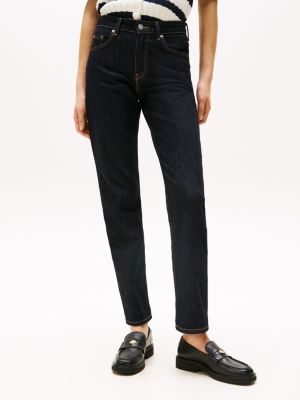 The straight-leg silhouette offers a clean, streamlined profile that lets you transition seamlessly from relaxed daytime looks to smart evening ensembles. The mid-rise waist provides good coverage and lasting comfort, making these jeans a great choice for on-the-go days. They're crafted from premium denim with a soft feel and gentle durability, while a hint of stretch means they move with you, never compromising shape or fit. Five-pocket styling delivers practicality and a timeless appeal that's further enhanced by the dark rinse punctuated with authentic orange stitchwork. Iconic Tommy Hilfiger branding sits on the coin pocket and waistband, adding a signature finish. These jeans are designed to flatter every figure, balancing contemporary style with classic denim heritage.