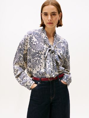 This oversized blouse with self-tie bow detail on the neckline is crafted from sateen viscose, creating a flowing and romantic silhouette.