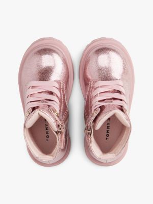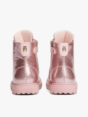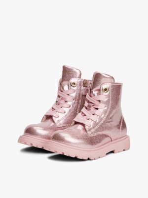 Inject some shine into her step with this pair of lace-up ankle boots, showcasing a gleaming finish and a grippy cleated sole.