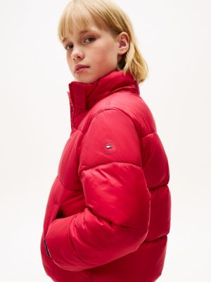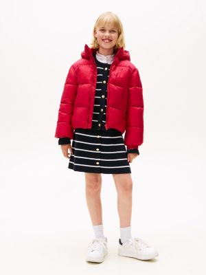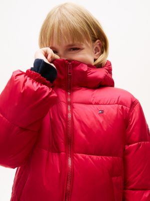 Stay stylishly cosy on chillier days with this shiny puffer jacket, featuring a snug hood and rib-knit cuffs.
