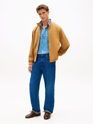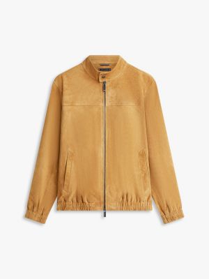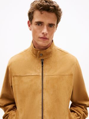 This premium suede jacket is an elevated take on the classic biker style, complete with elasticated trims and a glinting flag plaque.