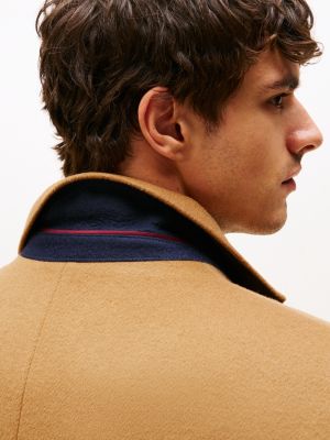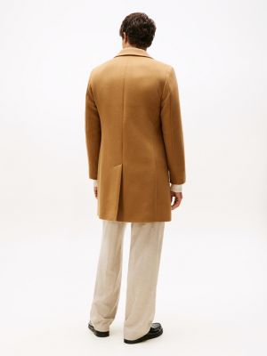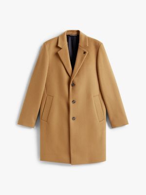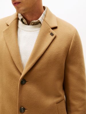 This refined coat is crafted from a wool-blend fabric and features notched lapels, neatly finished by a flag plaque pin.