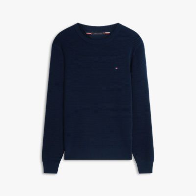 The textured knit on this crew-neck jumper adds intricate detail to a timeless design, with slightly dropped shoulders and discreet flag embroidery.