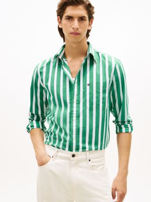 This pure peached cotton poplin button-down shirt, sporting a bold all-over stripe, is perfect for all-day wear with its four-way stretch technology.