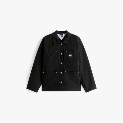 This chore jacket combines workwear styling with a contemporary aesthetic, featuring a boxy shape and tonal corduroy detailing on the collar.