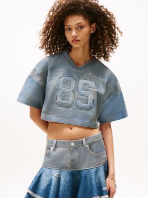 Drawing inspiration from the iconic football jersey, this V-neck top is crafted from supple washed denim-effect leather for an elevated preppy look.