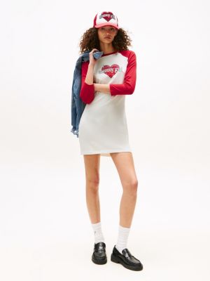 This mini T-shirt dress features archive-inspired heart branding and contrast raglan sleeves, creating a fusion of sweet and sporty energy.